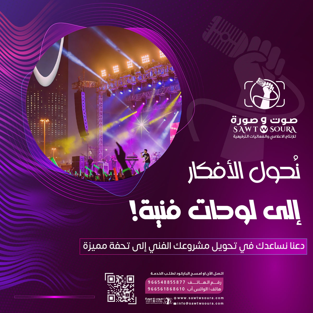 مؤسسة صوت وصورة تمتلك خبرة واسعة في تنظيم الحفلات الترفيهية والموسيقية في السعودية، وتحرص على تحقيق أعلى مستويات التنسيق بين الفنانين والمنظمين. تشمل خدماتها: